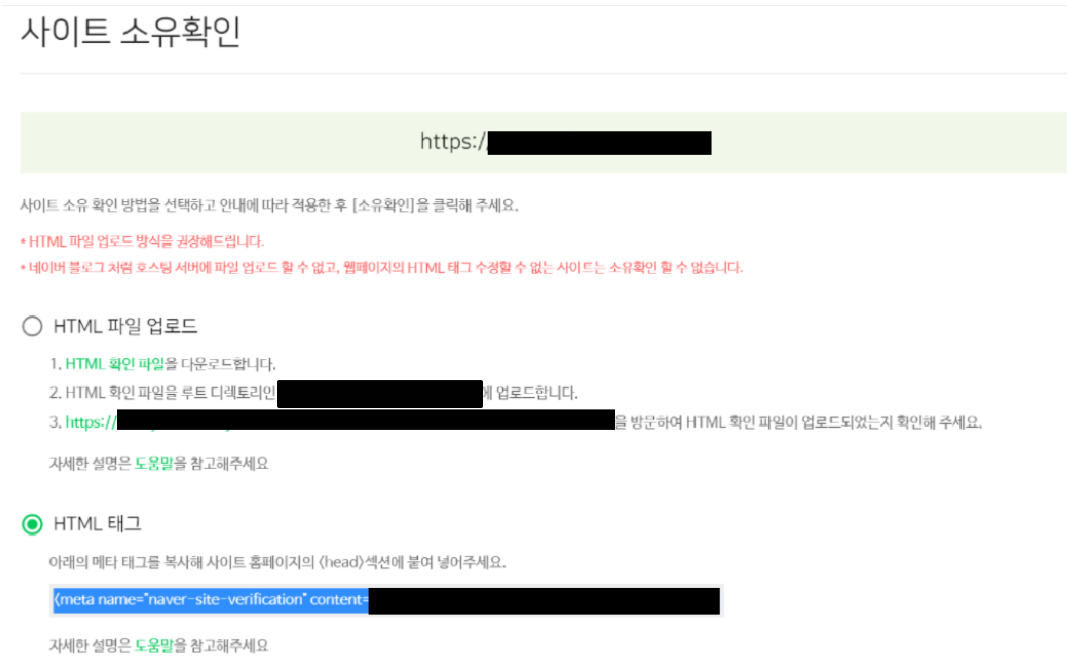 - HTML 태그 방식을 선택한 후, 네이버에서 제공하는 메타태그를 복사합니다.