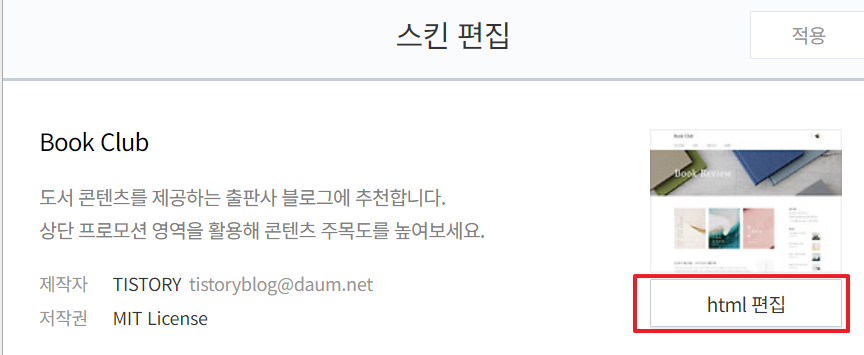 - **'꾸미기' > '스킨 편집' > 'HTML 편집'**으로 들어갑니다.