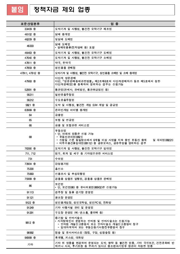 지원 제외 업종 목록은 도박기계 제조업, 담배 도매업, 성인용품 소매업 등이며, 정책자금 제외 업종(아래표참조)은 신청이 불가능합니다. 이번 확대 조치로 상반기에 지원을 받지 못한 소상공인들도 혜택을 받을 수 있게 되었습니다.