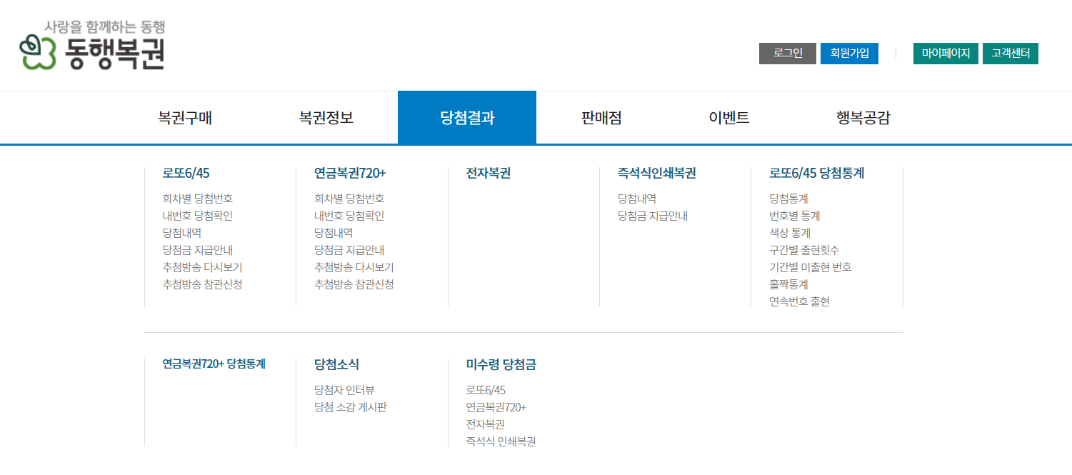 ✅ 로또 6/45, 연금복권720+, 전자복권 등 다양한 복권의 회차별 당첨 번호 및 개인 구매 번호의 당첨 여부는 '당첨결과' 항목에서 손쉽게 확인할 수 있습니다. 이 항목은 복권 종류별로 세부 메뉴를 제공하여 사용자에게 필요한 정보를 간편하게 찾아볼 수 있도록 구성되어 있습니다.