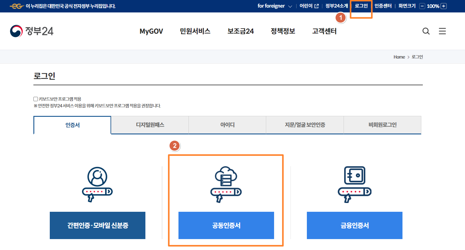 이제 정부24 웹사이트에 접속해 주세요. 접속 후 오른쪽 상단의 로그인 버튼을 클릭하고, 공동인증서를 사용해 본인 인증을 진행합니다.