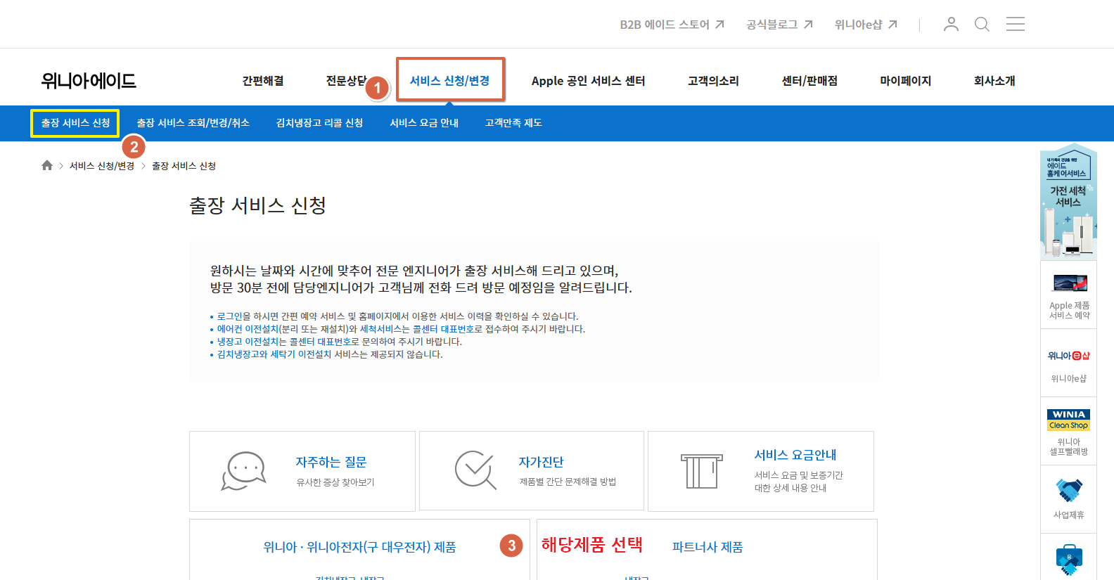 - 위니아에이드 홈페이지에서 제품과 증상을 선택한 후, 신청자 정보와 원하는 날짜·시간을 입력해 예약하실 수 있습니다.