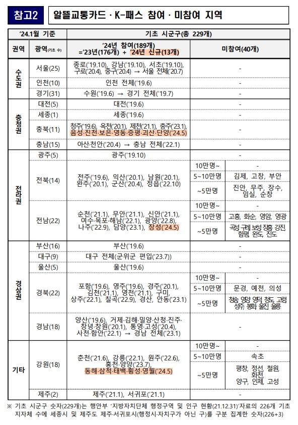 - 적용수단범위 : 시내버스, 지하철, 광역버스, 민자철도(신분당선 등) 등 교통카드 기반 대중교통수단 적용, 특정지역이 아닌 전국 단위 호환(예: 서울지역 가입자가 서울 외 다른 지역에서 대중교통 이용 시에도 혜택 적용)