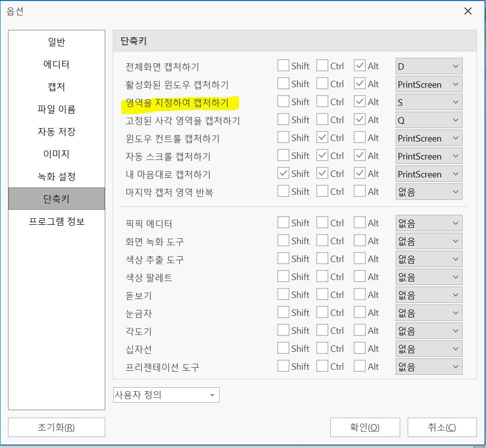 단축키 지정: 자주 사용하는 캡처 기능을 단축키로 설정할 수 있습니다.